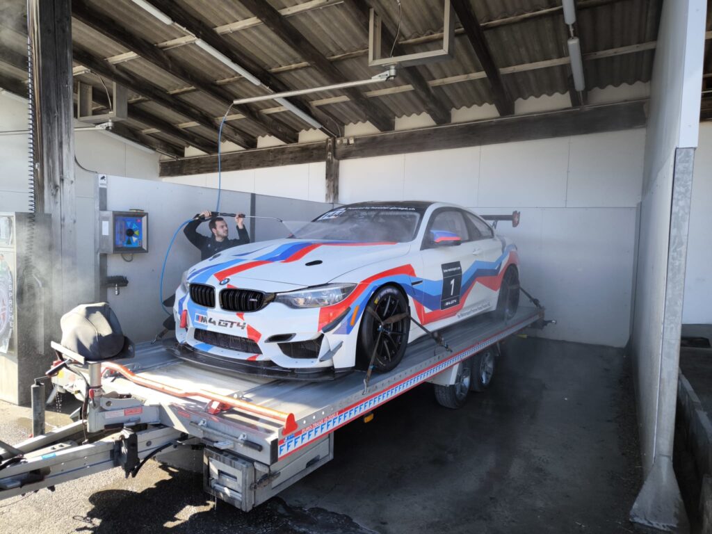 Der BMW M4 GT4 bekommt nach dem Leistungsprüfstand eine ordentliche Wäsche, freue mich aufs Trockenfahren.